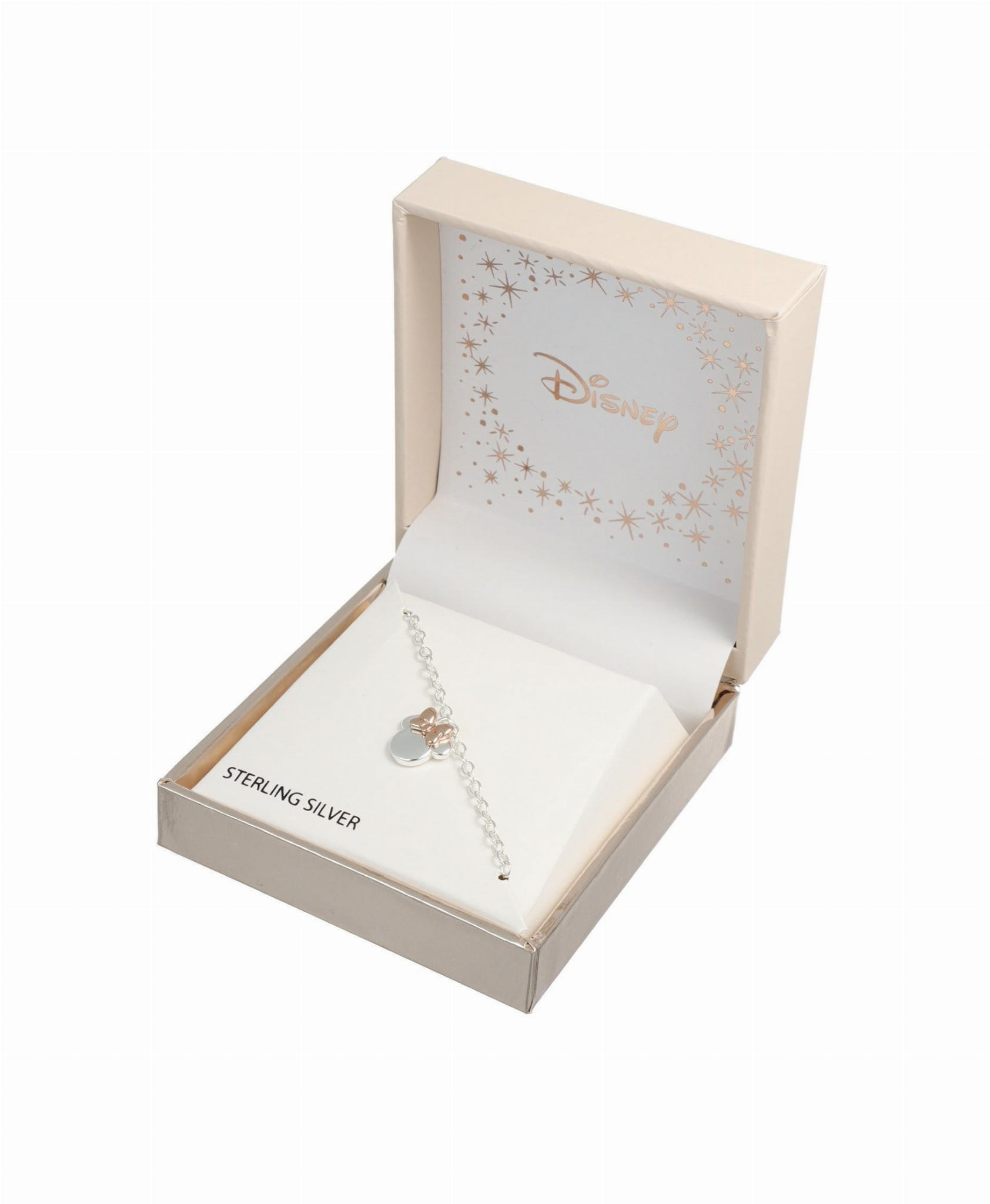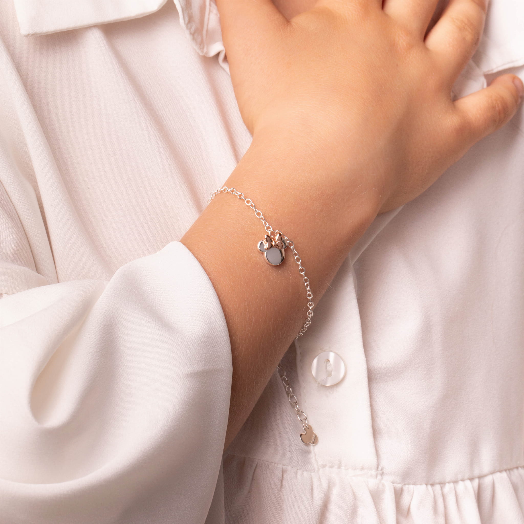 Opis: Bransoletka łańcuszkowa z kolekcji Disney Mickey Mouse dla dziewczynek. Kolor: srebrny i różowe złoto. Biżuteria wykonana jest z rodowanego i różowego srebra próby 925, z zawieszką przedstawiającą Minnie z kokardą w kolorze różowego złota. Zapięcie na karabińczyk..