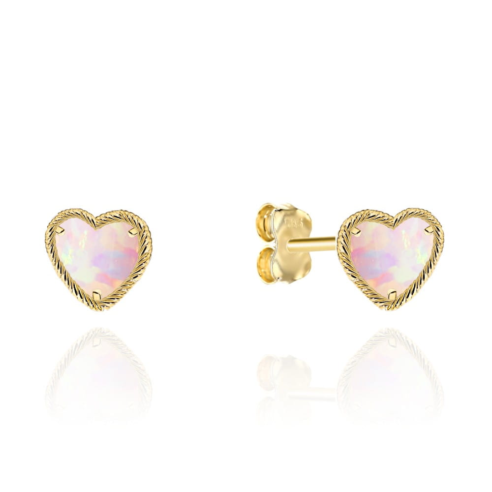 Kolczyki złote serduszka z różowym opalitem w plecionej oprawie