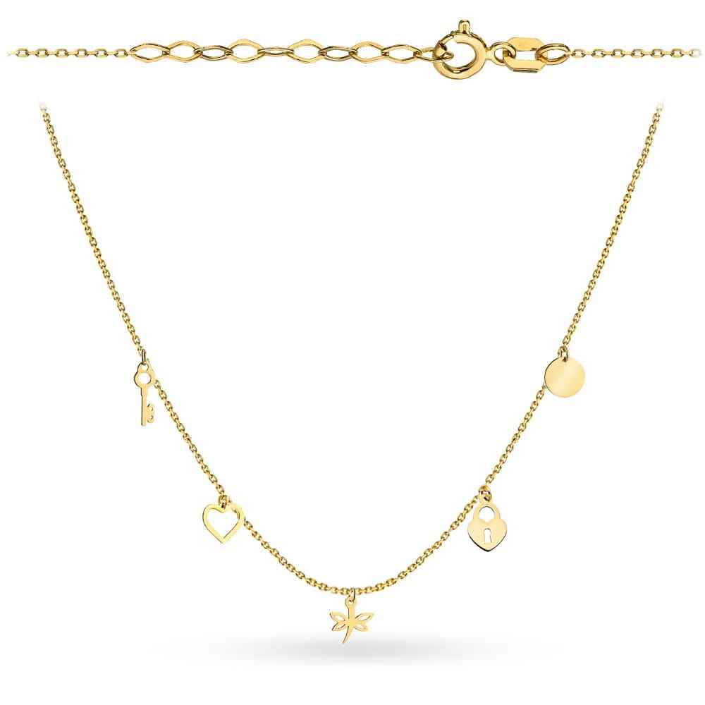 Naszyjnik złoty kluczyk, serce, ważka, kłódka i pełne kółko