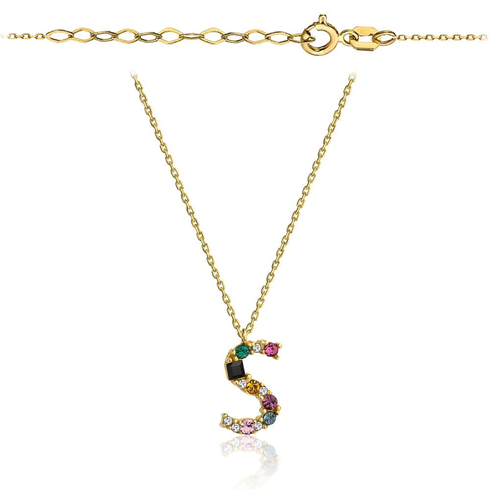 Naszyjnik złoty litera S z kolorowymi kamieniami